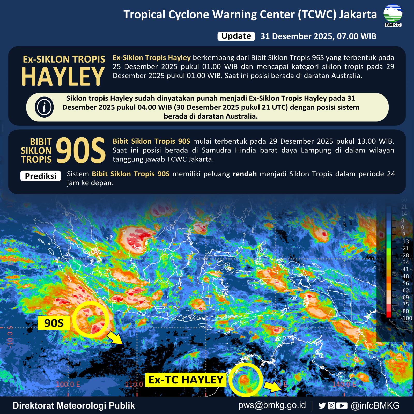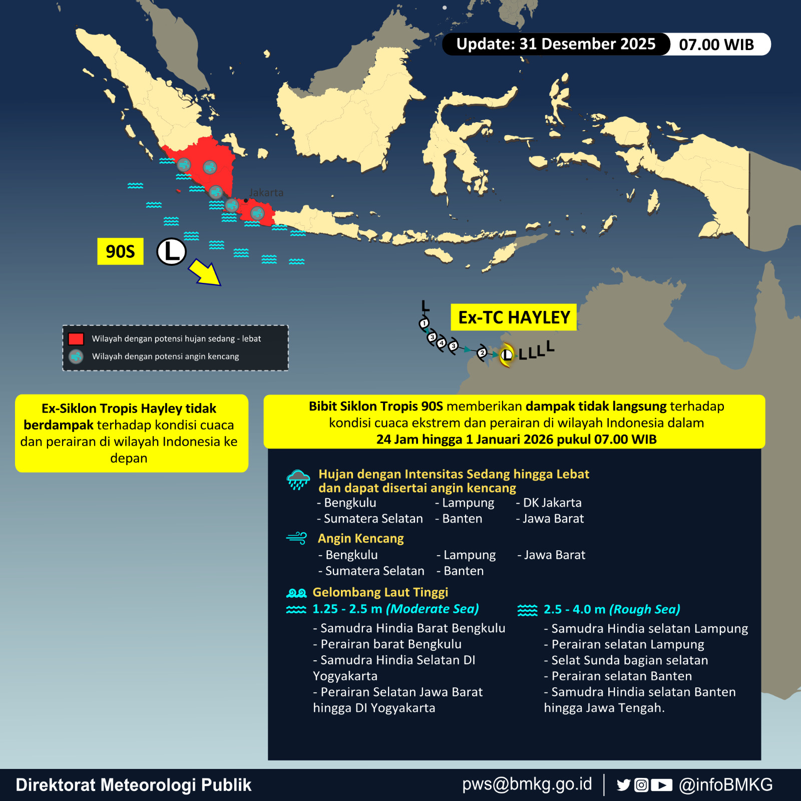Bibit Siklon Tropis 90S mulai terbentuk pada 29 Desember 2025 pukul 13.00 UTC (01.00 WIB) di wilayah Samudra Hindia barat daya Lampung.
